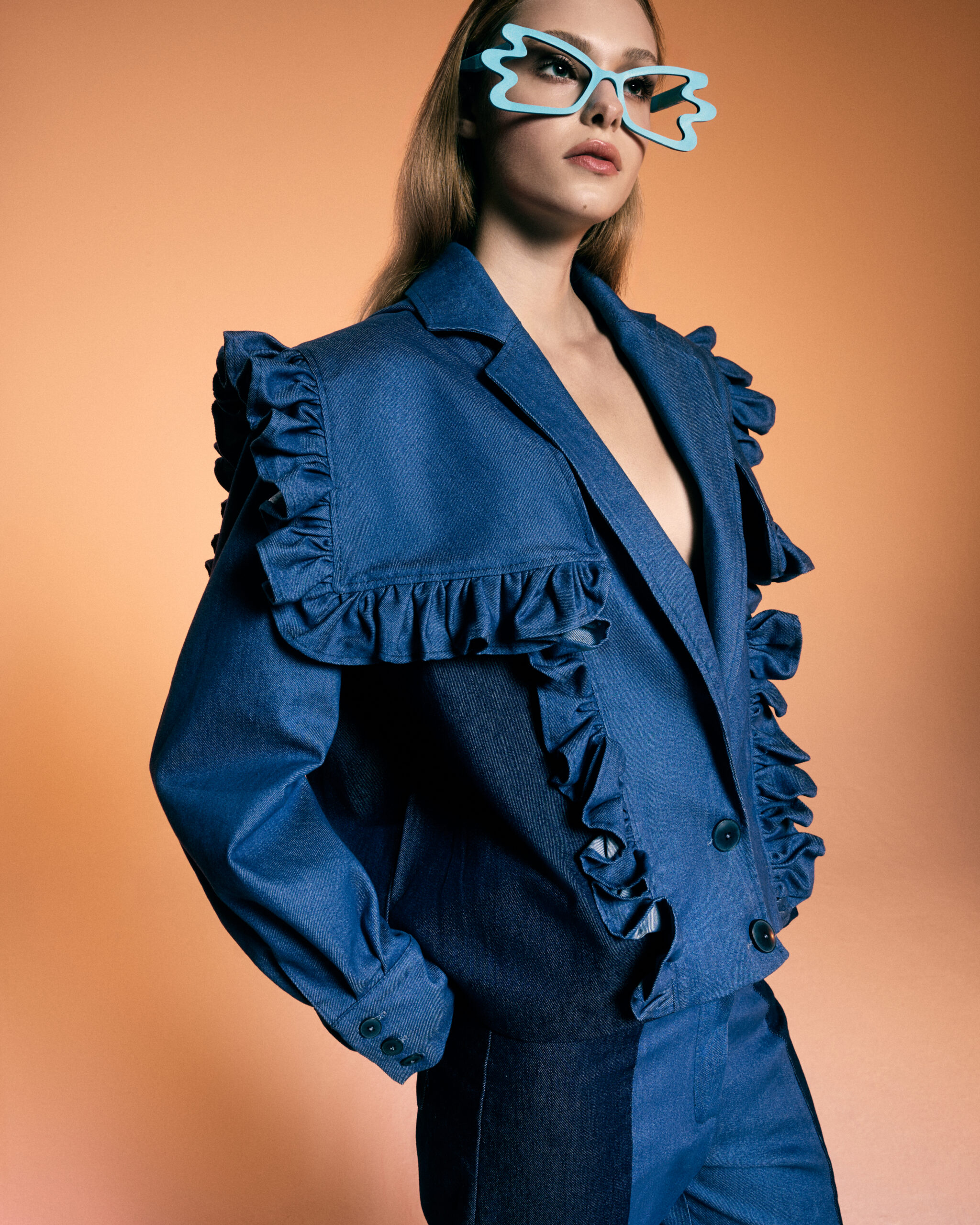 - Efektowna marynarka uszyta z cienkiego denimu w dwóch kolorach